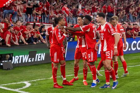 Die Mannschaft des FC Bayern feiert den Last-Minute-Siegtreffer (90.+4) von Michael Olise zum 4:3.