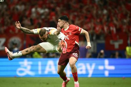 Vorbereiter David Raum hat nach dem Last-Minute-Tor der deutschen Fußball-Nationalmannschaft beim Gruppenfinale gegen die Schweiz kurzzeitig die Orientierung verloren. "In dem Moment, wo ich gejubelt habe, ist mir der Helm geplatzt. Ich habe alle Fans angeschrien, aber ich wusste nicht, wer das Tor gemacht hat", gab der Leipziger in einem vom DFB am Dienstag veröffentlichten Video zu und ergänzte: "Ich dachte, Toni Rüdiger hat den reingemacht."