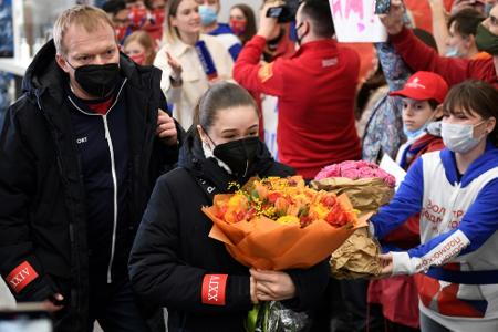Moskau (SID) - Die unter Dopingverdacht stehende russische Eiskunstläuferin Kamila Walijewa ist einen Tag nach ihrer weltweit beachteten Olympia-Kür in Peking in ihrer Heimatstadt Moskau gelandet. Die 15-Jährige wurde am Freitag von einigen Dutzend Fans am Flughafen Scheremetjewo unter Applaus empfangen, Blumensträuße wurden ihr gereicht.