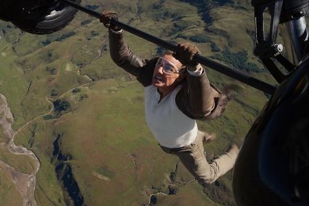 Der spektakulärste Stunt, den Cruise standesgemäß wieder selbst übernommen hat, trägt sich in der Luft zu: Er hängt dabei an einem Doppeldeckerflugzeug, das in der Luft um die eigene Achse rotiert. Mehrfach sei er während dieser Dreharbeiten ohnmächtig geworden, wie Cruise Anfang Februar dem Magazin "Empire" verraten hatte.
