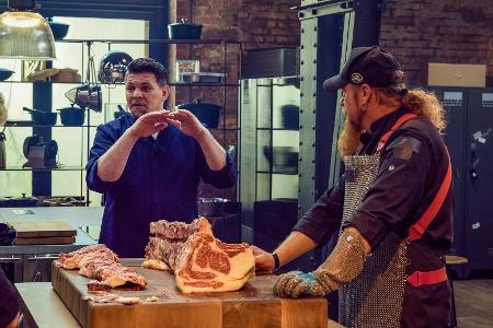 Für die kommenden Challenges ist den beiden jedoch wichtig, dass die Kandidaten den Umgang mit Fleisch erlernen. Aus diesem Grund zeigt ihnen Maurer zunächst, wie man die verschiedenen Teile des Rinds verarbeitet und diese zubereitet. "Filet braten kann jeder. Ihr braucht eine Pfanne, einen Kerntemperaturfühler, ein bisschen Hirn", erklärt er, bis er schließlich von Tim Mälzer unterbrochen wird. "Was brauchst du? Ich hau dir eine für Kerntemperatur... hier!", meckert er und zeigt seine beiden Finger. Nur mit diesen sollen die Kochschüler nämlich erkennen, ob das Fleisch gut gebraten wurde.