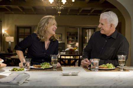Nancy Meyers geht es offenkundig um das Problem der Vorbelastung, von der wieder entfachte Liebe befallen wird, wenn sie in späteren Lebensjahren Knospen schlägt. Die brillant spielende Meryl Streep macht das spürbar. Sie will sich bedingungslos fallen lassen, doch der Verstand funkt dazwischen. Was in jungen Jahren so einfach schien, wird nun schwierig. Denn da ist ja noch der selbst frisch geschiedene Architekt Adam (ungewöhnlich introvertiert: Steve Martin), der versucht, zarte Bande zu seiner Auftraggeberin zu knüpfen.