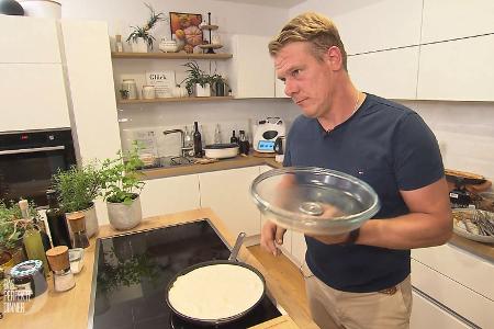 "Der Schmarrn hat seinen eigenen Charakter - wie wir Österreicher auch", erklärt er launig. Ist sein eigenes Naturell womöglich labbrig und leicht angebrannt? Die "Konsischtenz" (Jörg) seines Desserts ist es jedenfalls. "Das ist in die Hose gegangen", so der enttäuschte Gastgeber. "Im schlimmsten Fall wird's ein Pfannkuchen", witzelt Chiara noch. Doch der Schmarrn bleibt weich, zu weich. Andreas schaut ratlos in die Pfanne: "Nicht gelungen. Was machen wir jetzt?" "Anrichten", sagt Jörg, und Carina tröstet: "Es duftet nach Wohlfühlen."