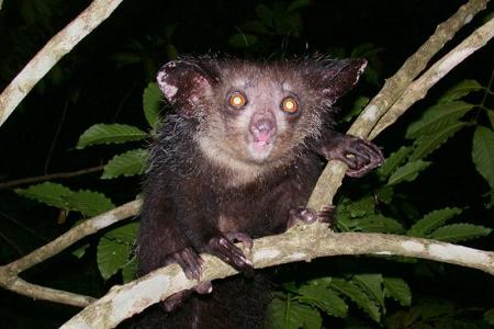 ...ein Aye-Aye oder Fingertier - unschwer an seinen riesigen, abstehenden, schwarzen Ohren zu erkennen. Seine kreisrunden, giftgrünen bis gelben Augen sind immer weit aufgerissen und umrandet mit einem schwarzen Ring, was seinen Anblick nicht freundlicher macht.