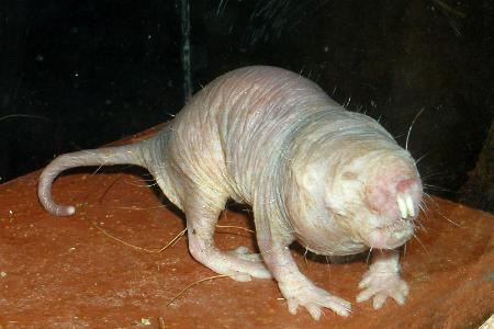 Nacktmull - Der Nackt- oder Graumull ähnelt einer blinden Ratte, die in Enthaarungscreme gefallen ist. Seine Haut ist weißlich-grau und lässt die Adern durchschimmern. Nacktmulle haben sich völlig dem Leben unter der Erde angepasst.