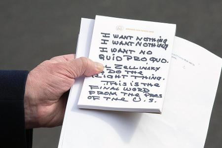 "Ich will nichts", schrieb Trump in Großbuchstaben und mit schwarzem Filzstift auf den Notizzettel für sein Pressestatement zu den Impeachment-Ermittlungen. Ganz zum Amüsement der Internetgemeinde.