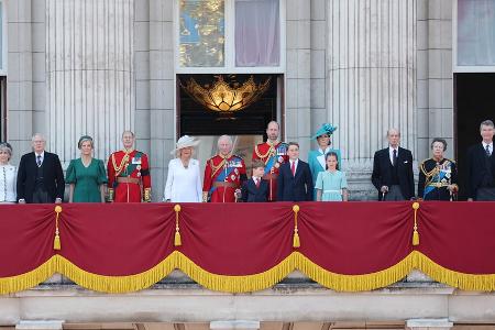Ebenfalls auf dem Balkon zu sehen waren der Herzog und die Herzogin von Edinburgh, Prinz Edward und Sophie. Sophie entschied sich für ein dunkelgrünes Ensemble. Zudem zeigten sich Prinzessin Anne mit Ehemann Sir Timothy Laurence, der Herzog von Gloucester mit seiner Frau sowie Prinz Michael von Kent.