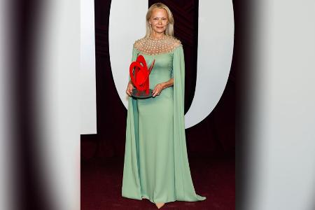 Bei dem Event der Zeitschrift "Glamour" am Dienstag (8. Oktober) schritt Anderson in einem mintgrünen, bodenlangen Kleid über den roten Teppich. Ihr Dekolleté war vom Hals bis über die Schultern von einem transparenten, mit glitzernden Perlen besetzten Stoff bedeckt. Ihr blondes Haar trug sie offen, der ehemalige "Baywatch"-Superstar hatte lediglich den Pony zur Seite geschwungen.