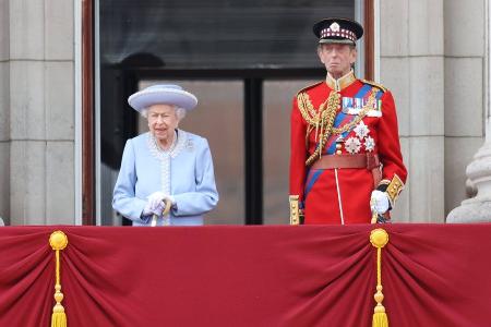 Queen Elizabeth II. (96) hat die Feier zu ihrem Platin-Thronjubiläum mit der "Trooping the Colour"-Parade eingeläutet. Die Königin erschien dafür mit Cousin Prinz Edward (86), Herzog von Kent, auf dem Balkon des Buckingham Palasts. Sie präsentierte ein hellblaues Mantelkleid mit weißen Perlen-Applikationen an der Naht, das sie auch auf ihrem offiziellen Jubiläumsporträt trägt. Dazu kombinierte sie einen farblich passenden Hut sowie eine Perlenkette und -ohrringe. Auch einen Gehstock hatte sie dabei.