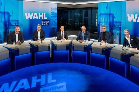 Nach den Sendungen am frühen Abend, die sich vornehmlich mit den ersten Hochrechnungen beschäftigten, begann um 20:15 Uhr die "Berliner Runde". Die Sendung mit ARD-Chefredakteur Oliver Köhr (49) und ZDF-Chefredakteurin Bettina Schausten (60) ging im Ersten und dem ZDF simultan an den Start, zu Gast waren die Spitzenkandidaten der einzelnen Bundestagsparteien. Im Ersten kam die "Berliner Runde" auf rund 7,6 Millionen Zusehende, weitere 4,0 waren es im ZDF. Die zusammengenommen 11,7 Millionen Zuschauer stellten einen Marktanteil von fast 40 Prozent dar. In der Gruppe der 14- bis 49-Jährigen waren es mit zusammen rund 3,7 Millionen sogar fast 50 Prozent.