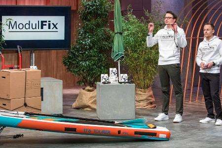 Michi (31) und Martin Kopp (33) sind Brüder und haben gemeinsam "ModulFix" entwickelt. Die Idee kam ihnen, als Michi sein Stand-up-Paddle am Gepäckträger seines Fahrrads befestigen wollte, aber keinen geeigneten Spanngurt fand. Also erfanden die Gründer "ModulFix", einen individuell anpassbaren Gurt mit austauschbaren Haken. Um ihr Spanngurtsystem in die Haushalte zu bringen, brauchen die Gründer 100.000 Euro für 20 Prozent.