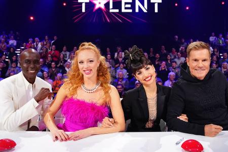 In der 16. Staffel bewerten Bruce Darnell (v.l.), Anna Ermakova, Ekaterina Leonova und Dieter Bohlen die Kandidaten der RTL-Show "Das Supertalent" (samstags, 20:15 Uhr). Bohlen war bis auf die 15. Staffel im Jahr 2021 stets dabei, Bruce Darnell zählt mit elf Staffeln ebenfalls zum Urgestein.