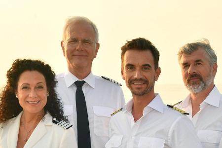 "Das Traumschiff": Zur aktuellen Besatzung gehören unter anderem (v.l.) Hoteldirektorin Hanna Liebhold (Barbara Wussow), Kreuzfahrtdirektor Oskar Schifferle (Harald Schmidt), Kapitän Max Parger (Florian Silbereisen) und Staff-Kapitän Martin Grimm (Daniel Morgenroth).