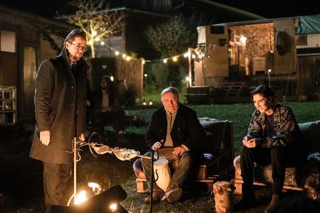 "Tatort: Rhythm and Love": Prof. Boerne (Jan Josef Liefers) und Kommissar Thiel (Axel Prahl) sitzen mit Inès Fournier (Maelle Giovanetti, v.l.) am Lagerfeuer.