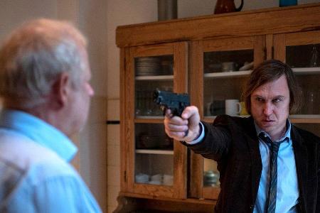 "Tatort: Borowski und der gute Mensch": Kai Korthals (Lars Eidinger, r.) zielt auf Borowski (Axel Milberg).